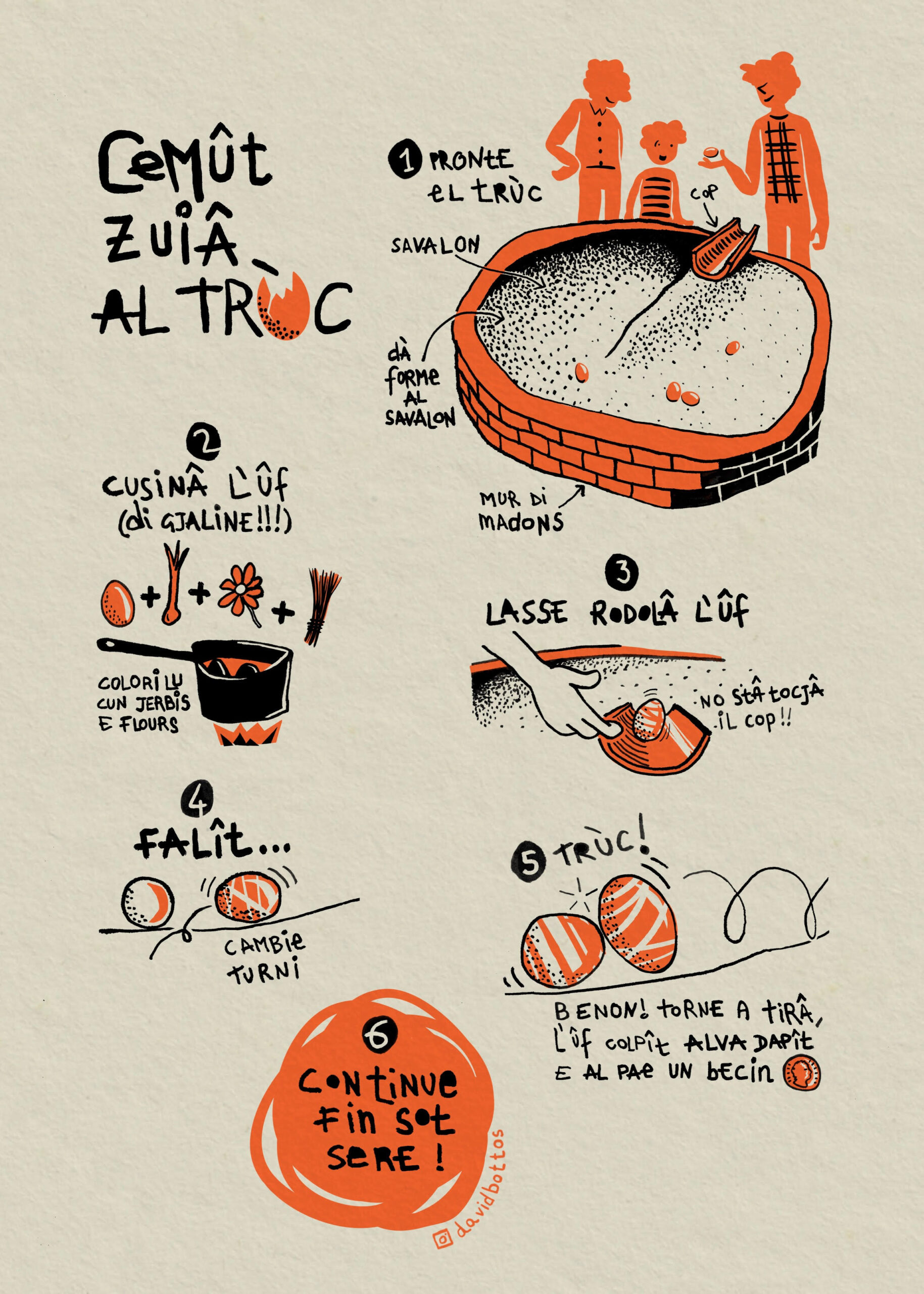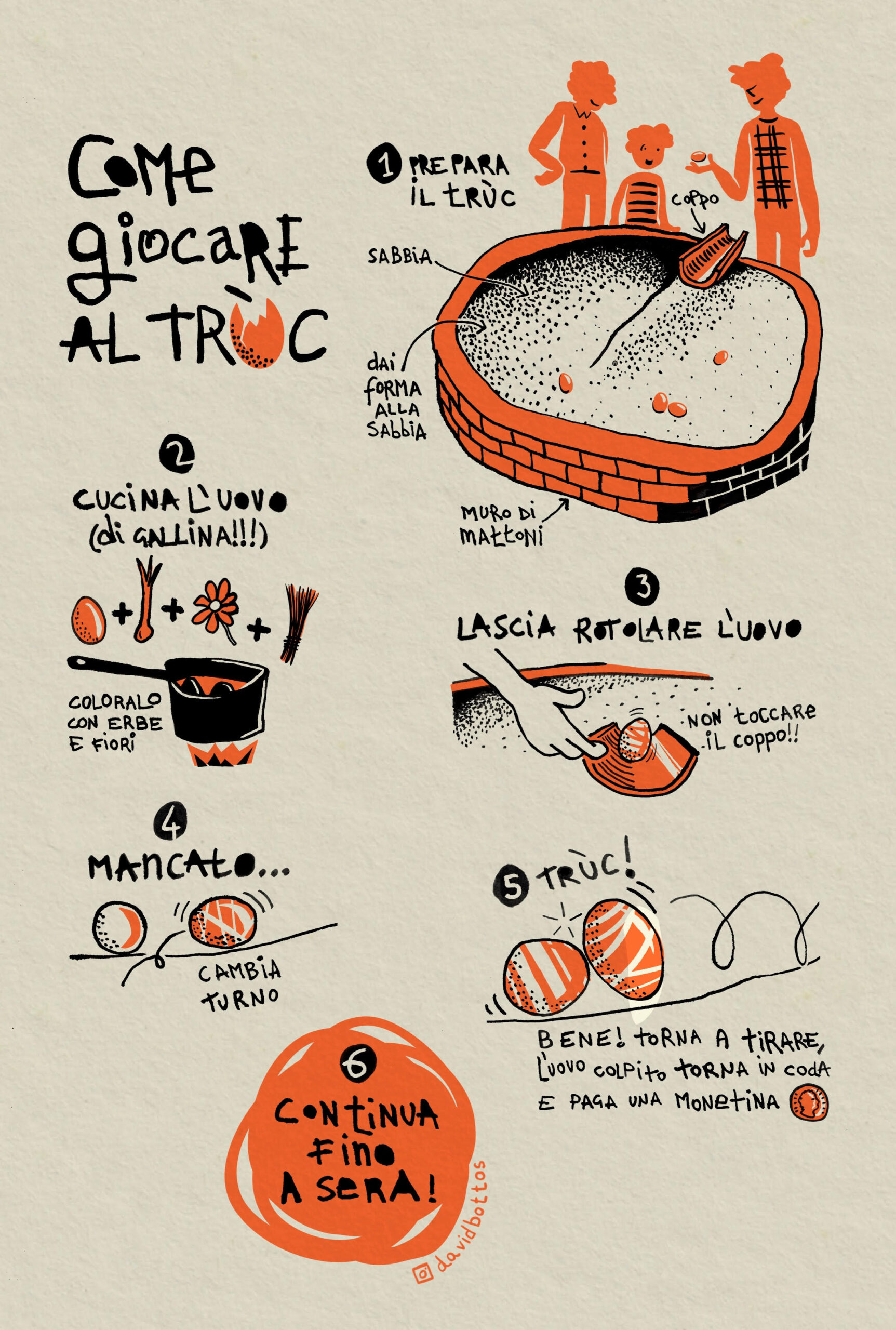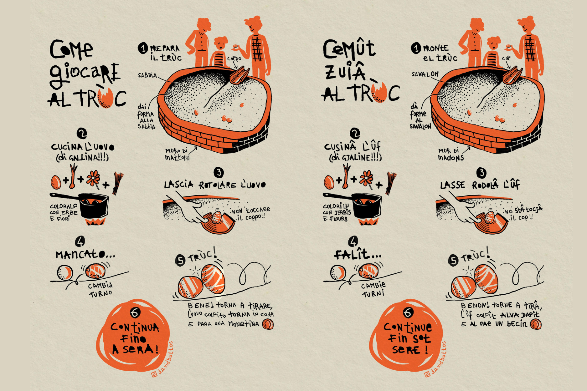 A Cividale del Friuli, comune di 10966 abitanti in provincia di Udine, ogni anno, a Pasqua e Pasquetta, si pratica una singolare usanza ludica che risale al XVIII secolo: il gioco del Truc. Questo consiste nel predisporre un’ampia conca di sabbia, dalla caratteristica struttura ovale e incavata. Per giocare si fanno scendere, seguendo precise regole, uova sode colorate con l’intento di farle toccare tra loro. “Truc”, infatti, è un nome onomatopeico che richiama il rumore di oggetti che si urtano l’un l’altro. Lo scopo del gioco è proprio quello di far scivolare le uova di gallina, sode e colorate, nella conca di sabbia dalla forma ovale, con l’intento di farle battere tra loro. Un tempo, al termine delle lunghe sedute di gioco, il variopinto uovo fatto rotolare innumerevoli volte era poi sempre consumato nel pasto serale, anche se parecchio ammaccato. In questi ultimi decenni, con il vigoroso sforzo congiunto di varie realtà associative locali, il truc è tornato ad essere ampiamente praticato celebrando con l’uovo, simbolo di fertilità e di nuova vita, la rinascita primaverile e la Pasqua.